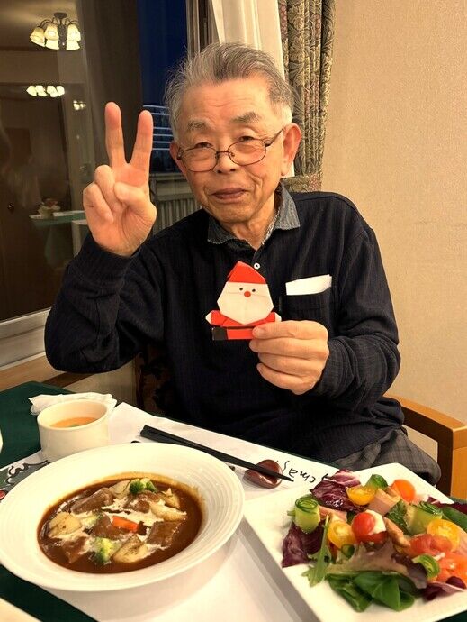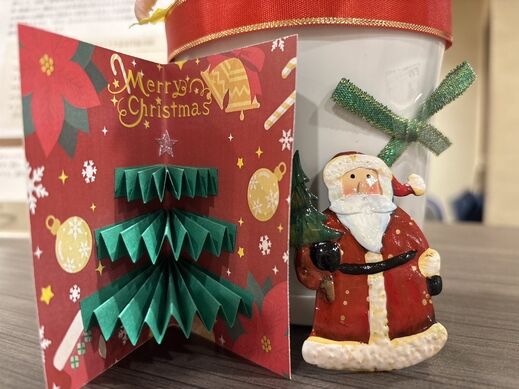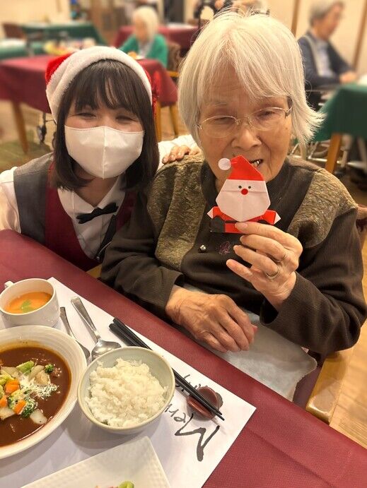 厨房スタッフより、クリスマスカードとサンタクロースの折り紙飾りが🎅