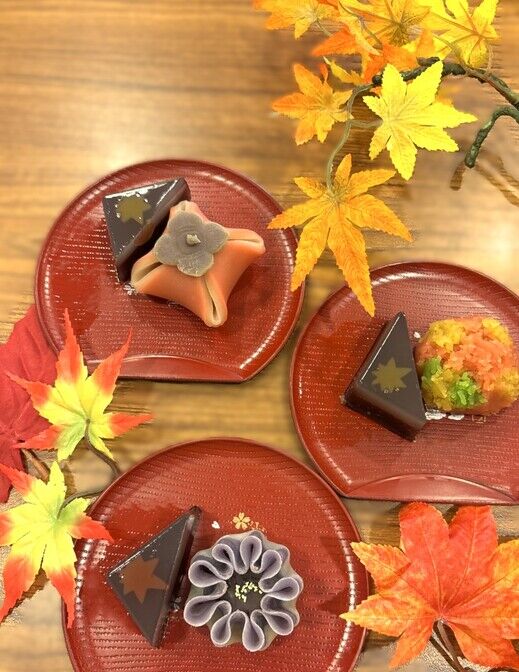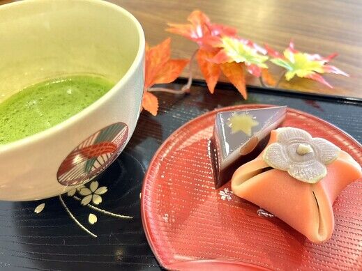 お抹茶に、紅葉をモチーフにした上生菓子と羊羹を添えて、お茶の時間をお楽しみいただきました。