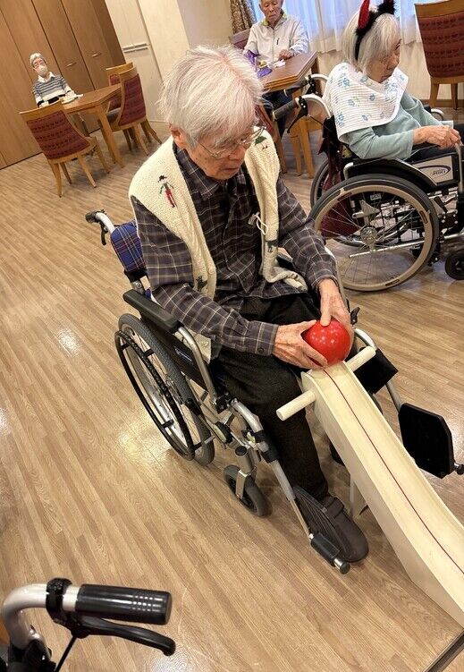 こちらのボーリングは座った状態でも出来るようになっており、滑り台の上からボールを転がせながらピンを倒すようになっています。