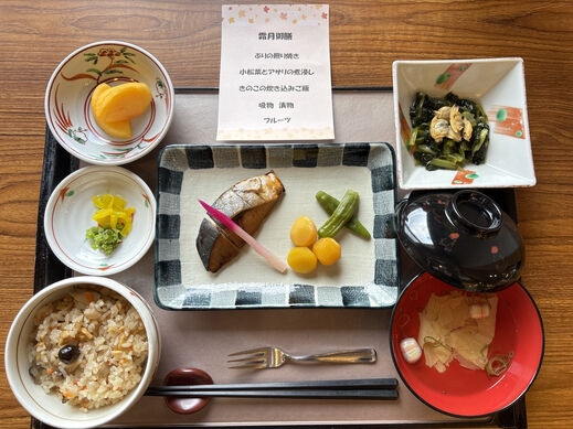 ぶりの照り焼きは付け合わせに栗を、炊き込みご飯にはきのこ、フルーツに柿など、秋の味覚を沢山詰め込んだスペシャルメニューが実施されました。