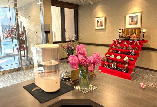今年から1階フロントに小ぶりのひな壇を設置しました。