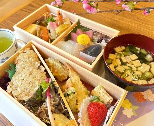 お造りや天ぷら、炊き込みご飯、炊き合わせなどが2段にバランスよく詰められた華やかなお弁当です🎶