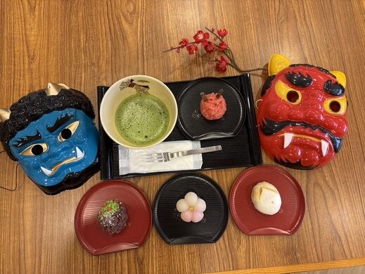 喫茶で提供する和菓子には赤鬼や梅の花など、季節に合わせたさまざまな上生菓子が並び、皆さま「食べるのがもったいない」と和菓子に見入っていらっしゃいました(^^♪