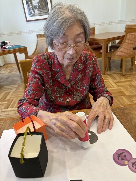 その後、園児と一緒にかぼちゃの入れ物に飾り付けをしました。
