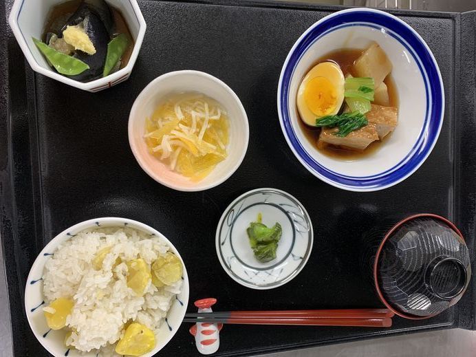 さらにA食、B食共通して、栗ごはんと共に副菜としてナスの生姜煮、柿なますが彩りを添えています☆