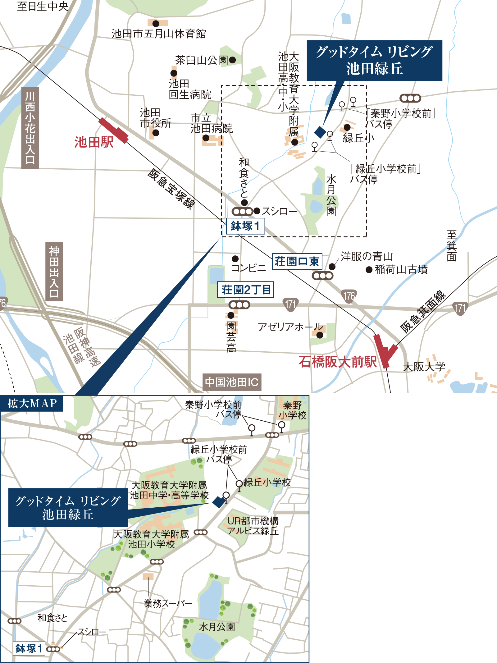 阪急宝塚線「石橋阪大前」駅より阪急バス「緑丘小学校前」バス停下車徒歩約1分(約5m)、または「秦野小学校前」バス停下車徒歩約5分(約400m)、またはタクシーで約4分(約1.8km)