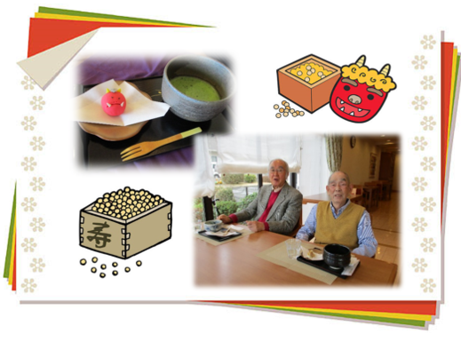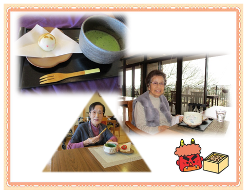 抹茶クラブ~節分茶屋~ 2021年02月10日(水) 2月2日(火)に抹茶クラブ~節分茶屋~を開催。 節分の日に合わせた上生菓子にゲストの皆さまに喜んでいただけました。 上生菓子は2種類をご準備し、選んでいただきました。 かわいらしい上生菓子に自然と笑顔に。 ゲストハウスの設え、グッドタイムクラブの行事や食べ物からも季節を感じていただけるようにご提供してまいります。 ★大阪府池田市の有料老人ホーム 『グッドタイム リビング 池田緑丘』の詳細はこちらからご覧いただけます> 前の記事 2021.02.09 豆まき 次の記事 2021.02.12 2月スペシャルメニュー アーカイブ 2025年12月 (2) 2025年11月 (8) 2025年10月 (8) 2025年9月 (8) 2025年8月 (9) 2025年7月 (8) 2025年6月 (9) 2025年5月 (9) 2025年4月 (8) 2025年3月 (9) 2025年2月 (9) 2025年1月 (10) 月を選択 2025年12月 2025年11月 2025年10月 2025年9月 2025年8月 2025年7月 2025年6月 2025年5月 2025年4月 2025年3月 2025年2月 2025年1月 2024年12月 2024年11月 2024年10月 2024年9月 2024年8月 2024年7月 2024年6月 2024年5月 2024年4月 2024年3月 2024年2月 2024年1月 2023年12月 2023年11月 2023年10月 2023年9月 2023年8月 2023年7月 2023年6月 2023年5月 2023年4月 2023年3月 2023年2月 2023年1月 2022年12月 2022年11月 2022年10月 2022年9月 2022年8月 2022年7月 2022年6月 2022年5月 2022年4月 2022年3月 2022年2月 2022年1月 2021年12月 2021年11月 2021年10月 2021年9月 2021年8月 2021年7月 2021年6月 2021年5月 2021年4月 2021年3月 2021年2月 2021年1月 2020年12月 2020年11月 2020年10月 2020年9月 2020年8月 2020年7月 2020年6月 2020年5月 2020年4月 2020年3月 2020年2月 2020年1月 2019年12月 2019年11月