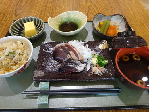 かつおのたたき、野菜の炊き合わせ、卵豆腐、山菜の炊き込みご飯、赤だしと、今の季節にぴったりのメニューです。