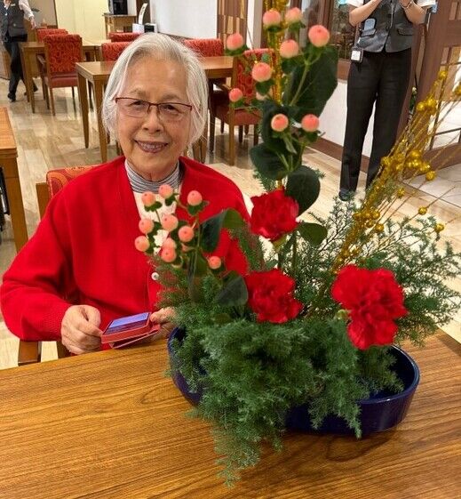 始めに講師の先生がお手本のお花を活け、その後お手本の生花を見ながら、それぞれの感性で活けていただきました。20241224_05.jpg20241224_06.jpg