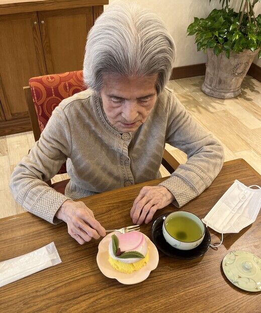 喫茶の時間に桜の映像をご覧いただいていると「そうそう!去年見に行った桜がきれいやったんよ、ちょっと待ってね。」と、パパパッと携帯電話の写真の履歴から探され、桜の写真を見せてくださいました。途中、とてもかわいい赤ちゃんの写真もご紹介いただきました。とても癒されました♡