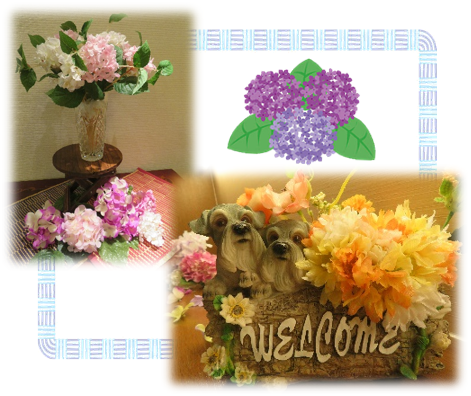 まず玄関口です。赤いベンチに色とりどりの紫陽花を持った