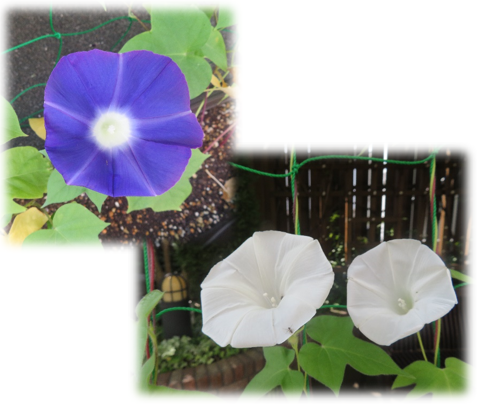 赤色や青色、そして珍しい白色のアサガオが咲き、庭園を彩ってくれています!
