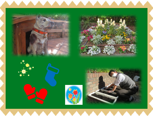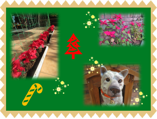 庭園の見張り番であるポチもお色直しをしており、その前には可愛いポインセチアが綺麗に列をなしています。