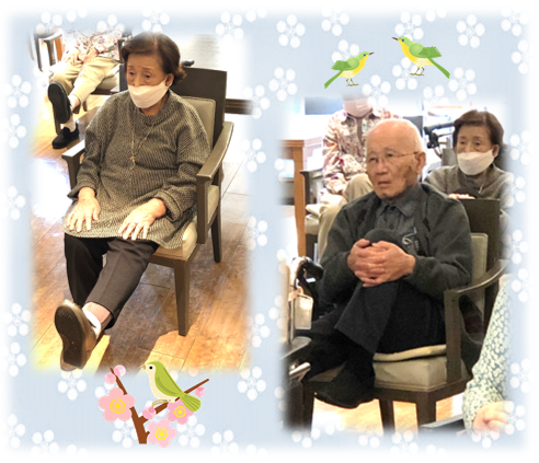 全て座りながらできる体操で、腕や足の曲げ伸ばしはもちろん、手指から全身の運動、ツボ押しなど内容は盛りだくさんです!