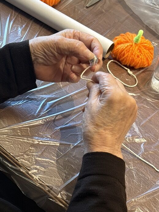 最後に短冊とカボチャの飾りに紐を通していきます。