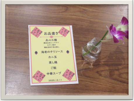 中華ランチ 2020年12月16日(水) 寒い季節になってきましたね。 本日は、中華のスペシャルランチを皆さま楽しみにされていました。 温かい中華ランチに、ほっこりとしたお食事のお時間を楽しまれました。 12月25日クリスマスディナーのお食事も心待ちにされています。 ★大阪府吹田市の有料老人ホーム 『グッドタイム リビング 千里ひなたが丘』の詳細はこちらからご覧いただけます> 前の記事 2020.12.14 『オンライン内覧』のお知らせ 次の記事 2020.12.29 お正月飾り アーカイブ 2025年10月 (4) 2025年9月 (6) 2025年8月 (7) 2025年7月 (7) 2025年6月 (5) 2025年5月 (6) 2025年4月 (5) 2025年3月 (4) 2025年2月 (4) 2025年1月 (8) 2024年12月 (4) 2024年11月 (2) 月を選択 2025年10月 2025年9月 2025年8月 2025年7月 2025年6月 2025年5月 2025年4月 2025年3月 2025年2月 2025年1月 2024年12月 2024年11月 2024年10月 2024年9月 2024年8月 2024年7月 2024年6月 2024年5月 2024年4月 2024年1月 2023年12月 2023年11月 2023年10月 2023年9月 2023年8月 2023年7月 2023年6月 2023年5月 2023年4月 2023年2月 2023年1月 2022年12月 2022年11月 2022年10月 2022年8月 2022年7月 2022年6月 2022年5月 2022年4月 2022年3月 2022年2月 2022年1月 2021年12月 2021年11月 2021年10月 2021年9月 2021年7月 2021年5月 2021年4月 2021年3月 2021年2月 2021年1月 2020年12月 2020年11月 2020年10月 2020年9月 2020年8月 2020年7月 2020年6月 2020年5月 2020年4月 2020年3月 2020年2月 2020年1月 2019年12月 2019年11月