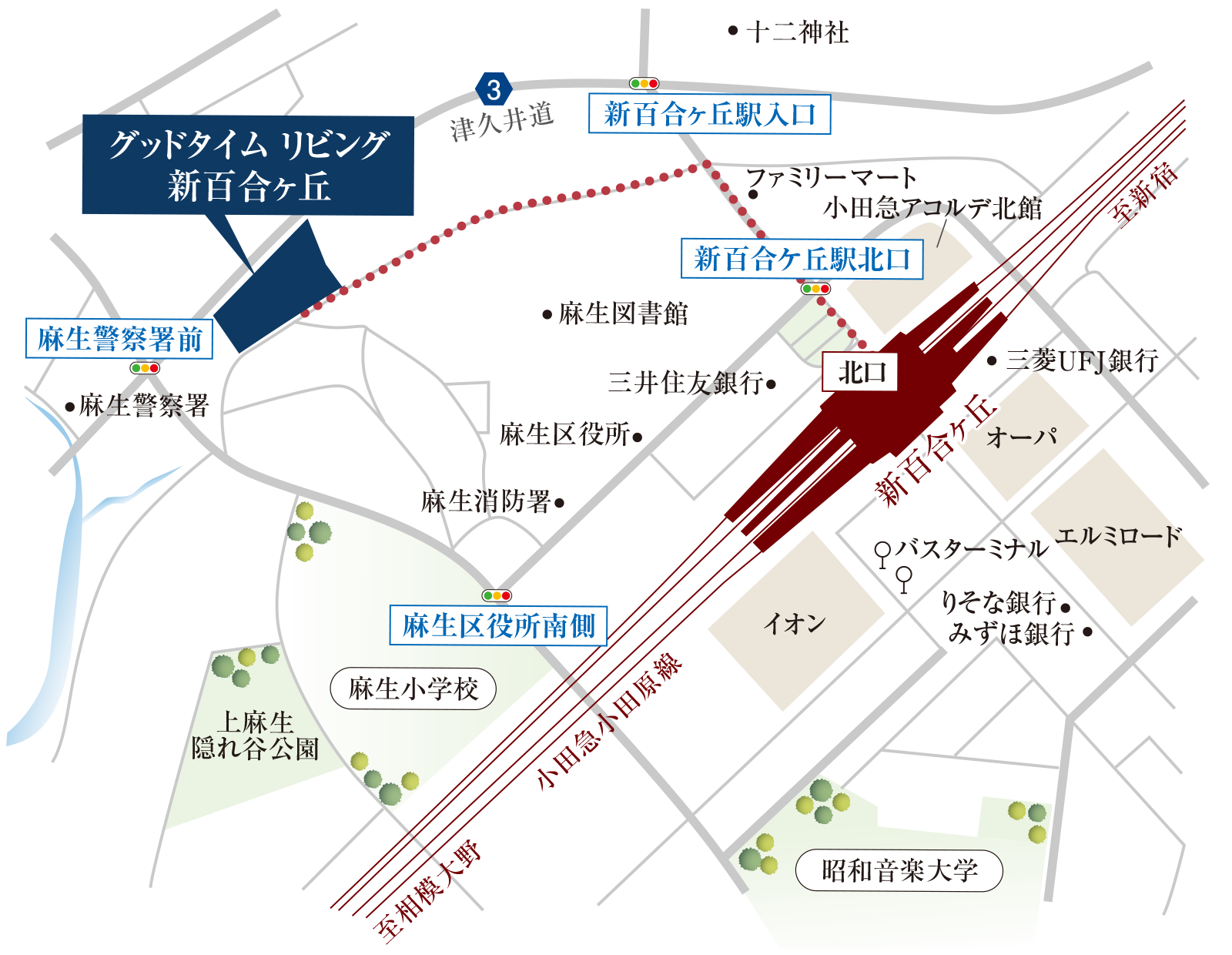 小田急線「新百合ヶ丘」駅北口より徒歩約6分(約420m)