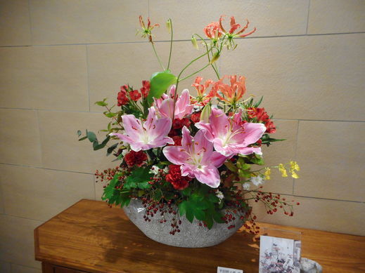 ピンクのユリを大胆に生けた、バランス良いアレンジメントが目を引きます。