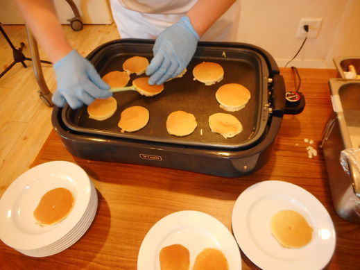 厨房スタッフがホットプレートでどら焼きの皮を焼いていきます。