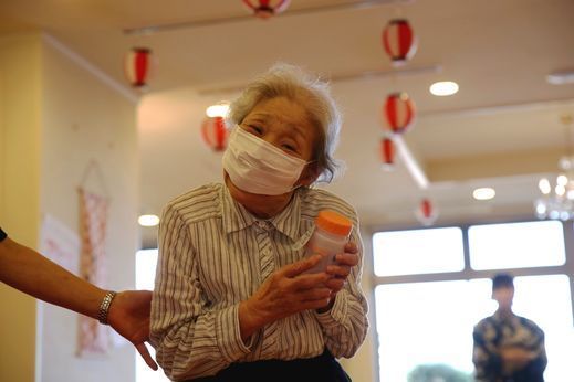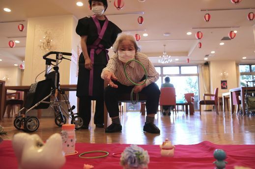 椅子に腰かけ、「それっ」と掛け声とともに景品めがけ投げます。