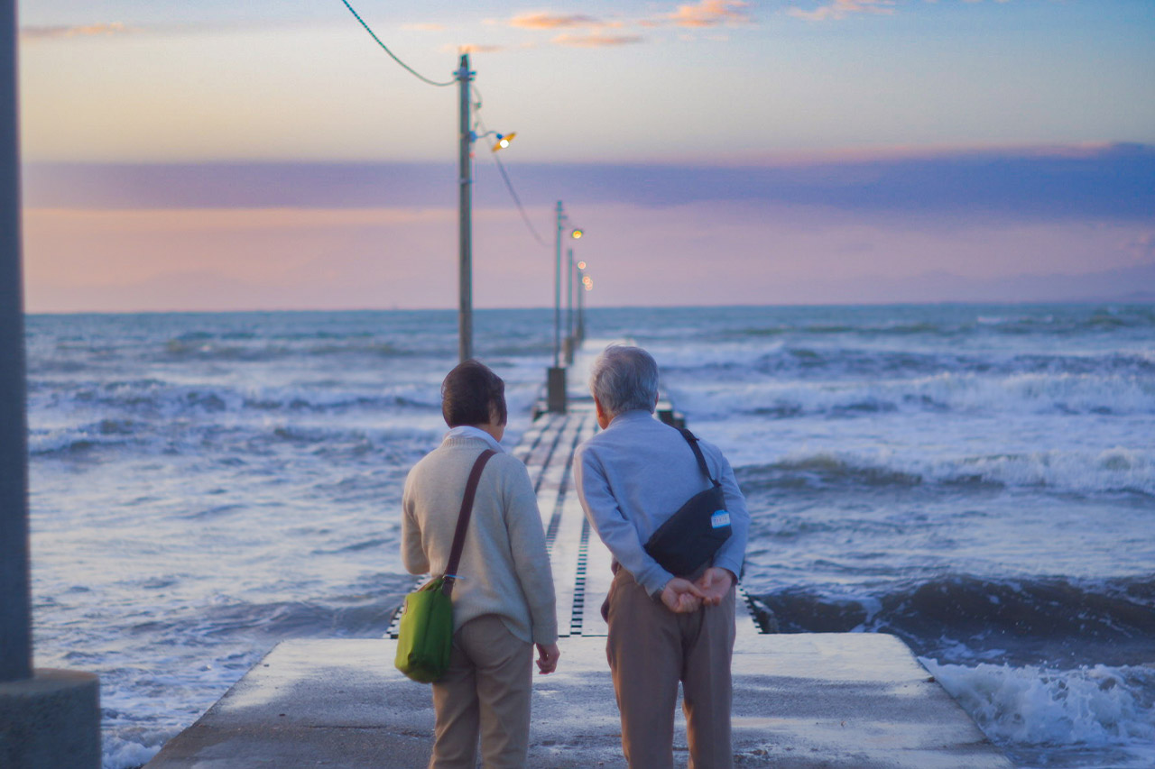■作品について/岡本桟橋を訪れた際に出会った、老夫婦のお二人を撮った写真です。先へと続く桟橋が、これまでとこれからの、お二人の人生の歩みを表しているようにも見えます。背中から伝わる仲睦まじい様子と、寄り添って同じ景色を見つめる姿がとても印象的でした。 私も将来はこんな素敵な年の重ね方をしたいです。