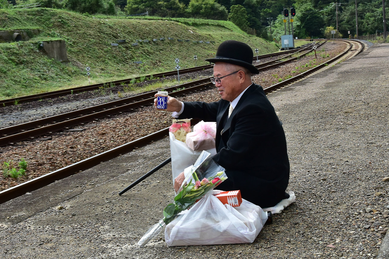 駅のホームでお酒を味わう表情と、たくさんの荷物と、なんとも魅力的な写真です。結婚式の帰りに思わず喜びをお酒と一緒に味わうなんて、粋ですねぇ。本当によい日だったことが想像できます。