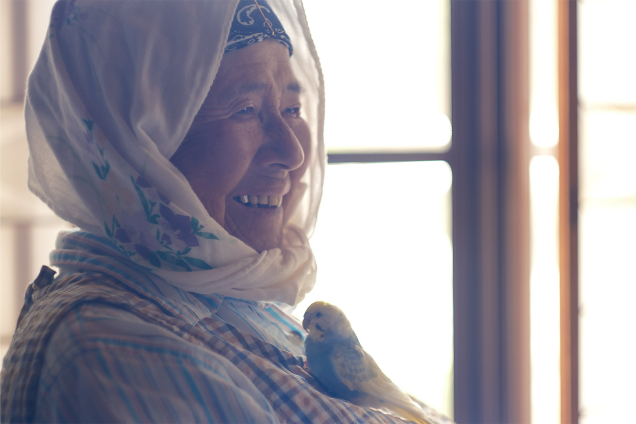 良い色、良い構図、良いトーン。そして良い表情。全て揃ったナイスな1枚です。相棒のインコでしょうか。可愛い小鳥とおばあさまの嬉しそうな表情がとても印象的で、それを望遠でクローズアップした構図と、淡い色味がより引き立てています。