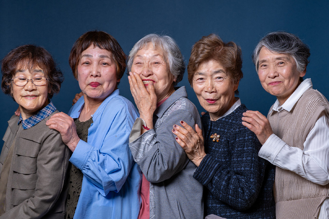 スタジオでしっかり撮影された、素敵なグループショットです。それぞれの個性が光る、皆さまが一緒に良い年を重ねられたことがとてもよくわかる写真です。いくつの時に出会ったかはそれぞれ違っても、それぞれを大切に思っていることが伝わってきます。撮影されたのはプロの方でしょうか。シンプルながら良いライティングと、見事な構図です。