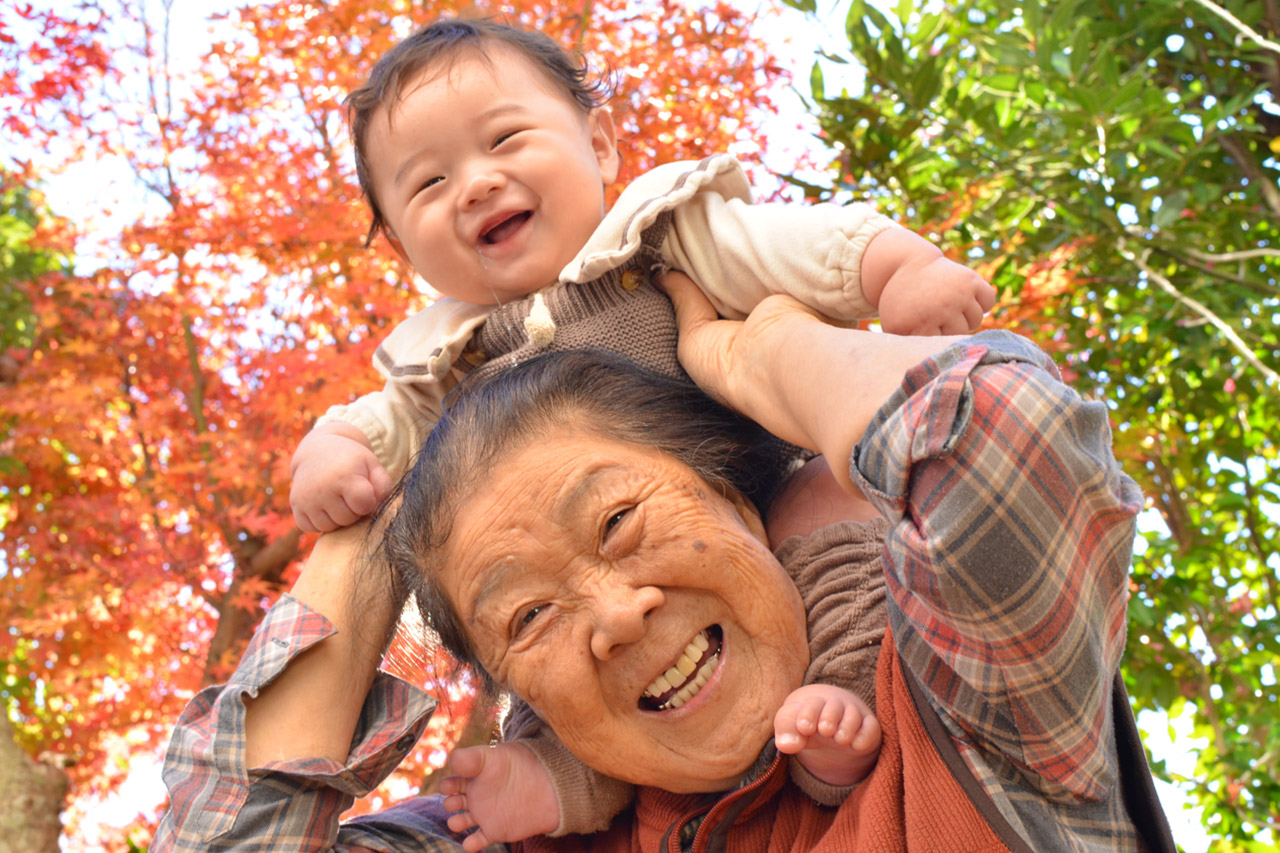 ■作品について/家の庭で83歳の祖母が私の0歳の子どもをあやしていて、丁度季節もいい時期で家の紅葉も立派に咲いていたので、少し無理を言って「肩車出来る?」と言ったらニコニコやってくれた時の奇跡の写真です。ちゃっかりよだれが頭に伝っているのもポイントです。ばあちゃんと私の子との1番のお気に入りの写真です。